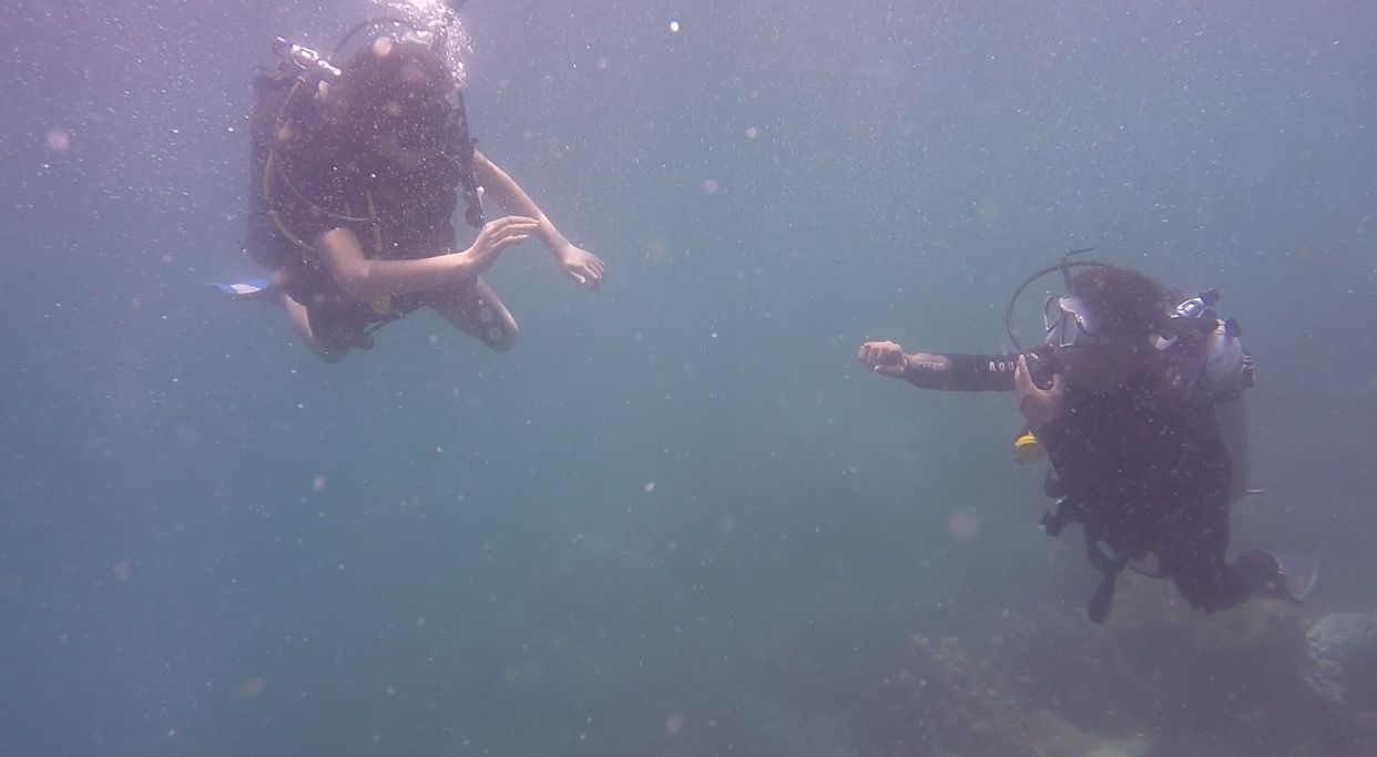 พอถึงปุ๊บ เรือจอดปั๊บ ยูซุฟก็อธิบายเกี่ยวกับไดฟ์ไซท์ให้ฟังคราวๆว่า Marini Rock นี้คือกองหินขนาดใหญ่ที่เต็มไปด้วยปะการังมากมายทั้งเนื้ออ่อนและเนื้อแข็ง มีความลึกสูงสุดอยู่ที่ประมาณ 22 เมตร แต่เราจะไปกันที่ประมาณ 18-19 เมตร ส่วนความตื้นอยู่ที่ประมาณ 3 เมตร เหมาะกับไดฟ์เวอร์ทุกระดับนะจ๊ะ พอลงไปปุ๊บให้ไปเป็นคู่นะ ค่อยๆว่าย ค่อยๆเอ็นจอย ตอนนี้เดี๋ยวเขาจะลงไปก่อนเพื่อเช็คว่ามีกระแสน้ำมั๊ย แรงแค่ไหน แล้วก็ทบทวนสัญญาณมือว่าอันนี้คืออะไร เป็นการรีเฟรชความรู้ในระดับหนึ่ง