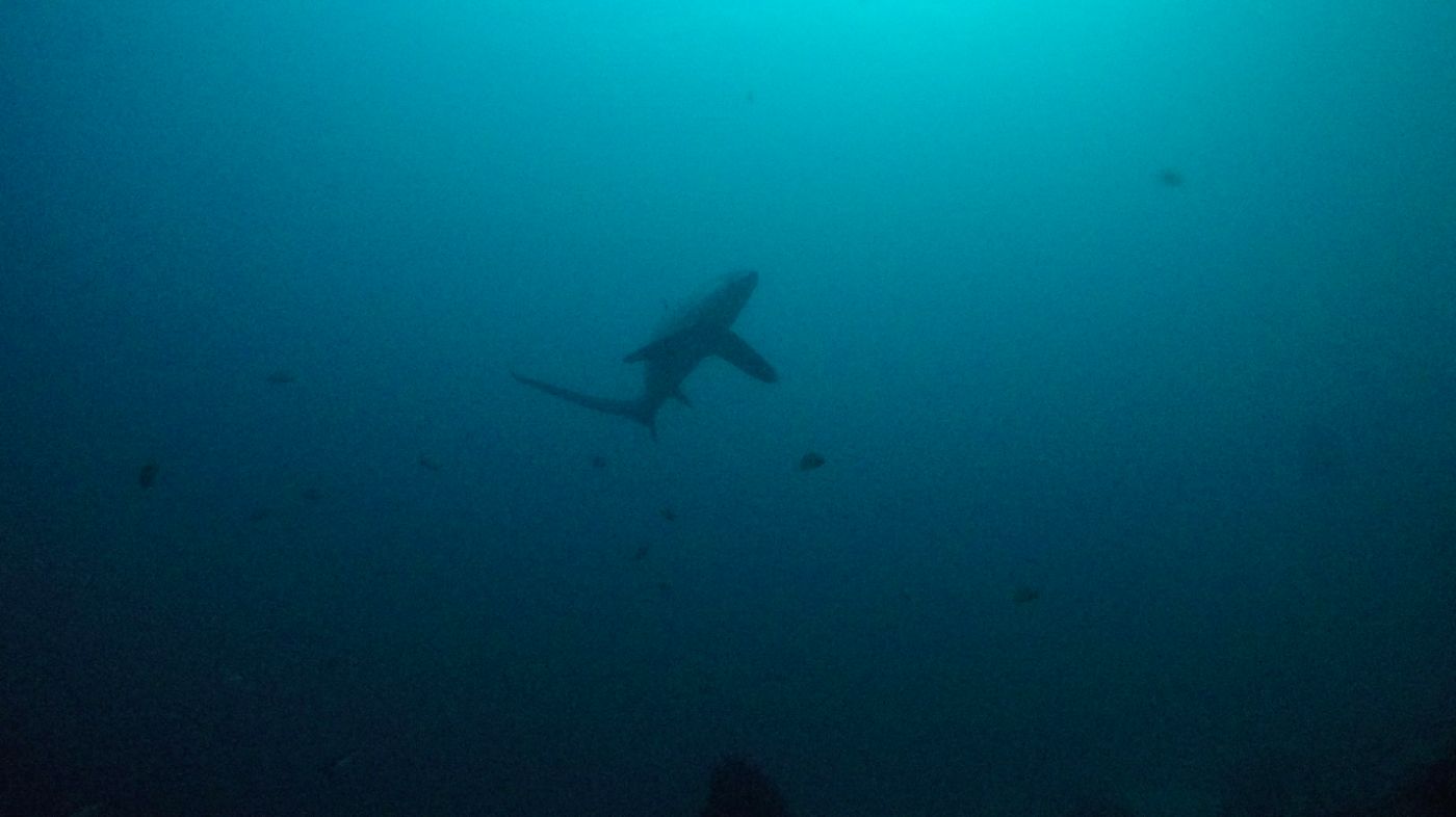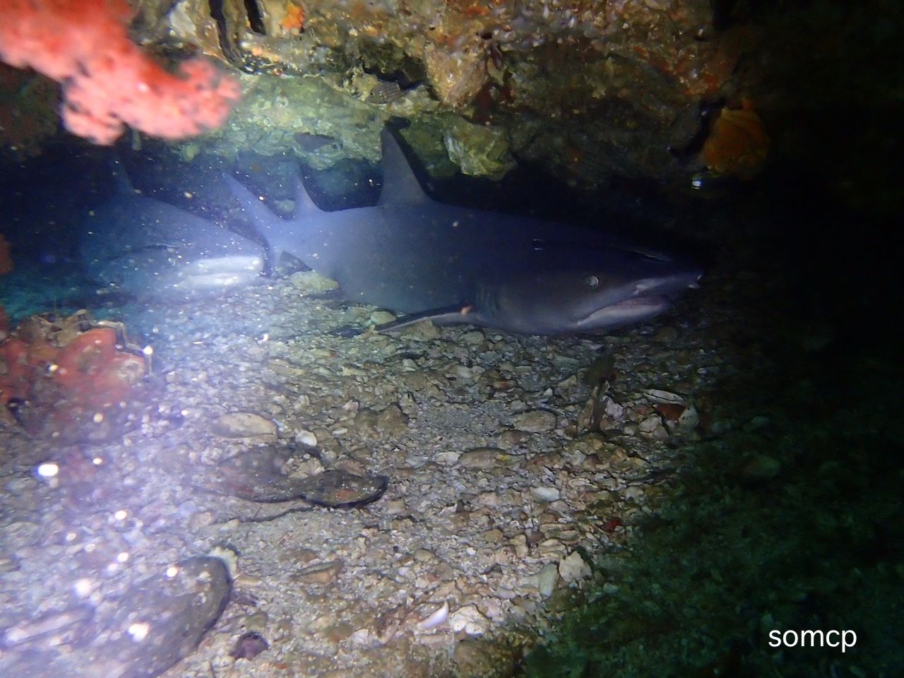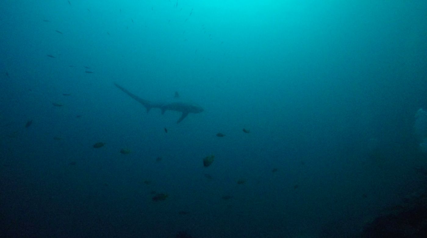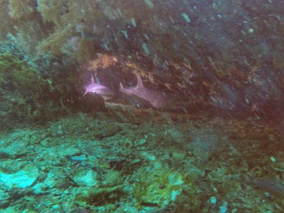 แต่ในความเฟลก็มีเรื่องฟินเกิดขึ้นเพราะเราเจอฉลามอีกแล้วจ้า คราวนี้เป็นฉลามครีบขาว (Whitetip reef shark) ที่ตามปกติแล้วก็พบเห็นได้ทั่วไปนั่นแหละ หาไม่ยาก แต่ความพิเศษคือตัวที่เจอนี่บึ้มมาก ตัวยาวเกือบสองเมตรได้แถมไม่ได้เจอเพียงหนึ่ง แต่มาเป็นแพคคู่กันสองตัว!