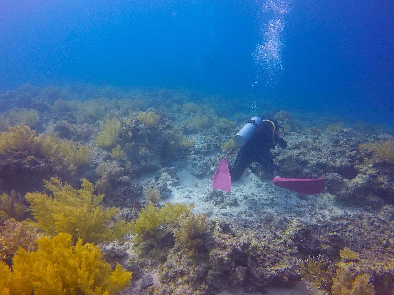 พอโดดตู้มลงน้ำไปแล้ว เราค่อยๆลดระดับความลึกลงไปเรื่อยๆจนถึงบริเวณเชือกที่กั้นไว้ ก็ไปนั่งคุกเข่านิ่งๆอยู่ตรงพื้นทราย จับเชือกไว้ และพยายามหายใจเข้าออกช้าๆให้เป็นจังหวะ พยายามคุมสติไว้ให้ดีเพราะกลัวว่าตัวเองจะหายใจเข้าเยอะไปเพเนื่องจากความตื่นเต้นแล้วตัวจะลอย ตอนนั้นคือแอบอึดอัดนิดนึง เรารู้สึกหายใจไม่สะดวกเพราะเราใส่หน้ากากแน่นเกินไป พอยิ่งลงไปลึกอากาศมันยังบีบอัดทำให้หน้ากากมันกดที่หน้าจนเจ็บ