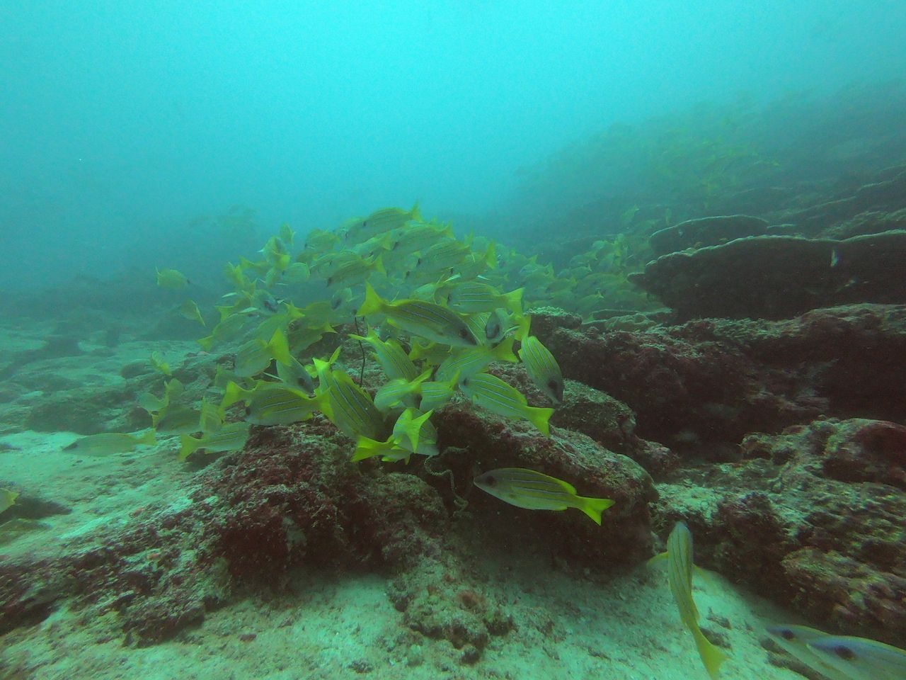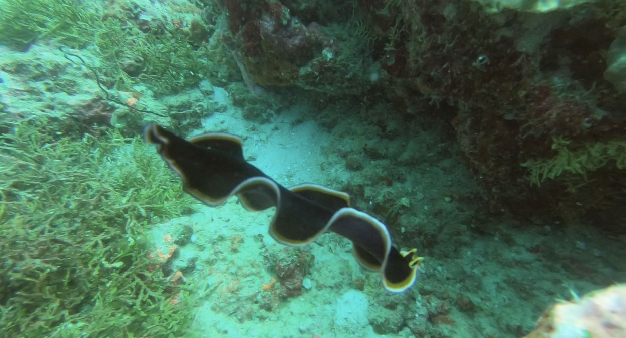 ปรากฎว่าน้องหลามที่นอนอยู่เกิดเปลี่ยนใจไม่นอนล่ะ ลำไยพวกมะนู้ดที่อยู่รอบข้างก็กลับตัวแล้วพุ่งพรวดมาทางข้าพเจ้า ไอ้เราก็ใจหายแว้บกลัวว่าน้องจะมาชนเลยทำตัวนิ่งๆเพราะไม่รู้ว่าจะหลบไปทางไหน น้องก็ว่ายผ่านตัวไปด้วยความไวแสงและหายไปในความครามของท้องทะเลลึก