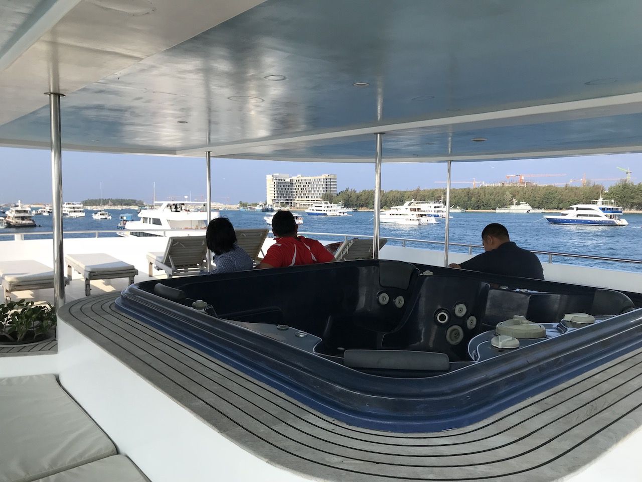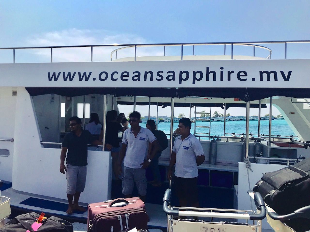 เราแล่นเรือจาก Male Atoll อันเป็นเกาะเมืองหลวงมายัง North Ari Atoll โดยใช้ระยะเวลาในการเดินทางประมาณ 3 ชั่วโมงจ้ะ ระหว่างทางคลื่นลมสงบดี ท้องฟ้าแจ่มใสสลับกับเมฆครึ้มและฝนปรอยเป็นพักๆ