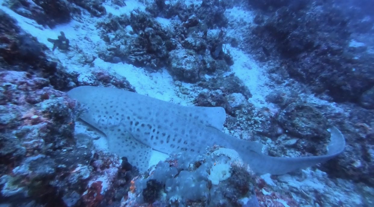 ตอนแรกเราก็จ๋อมแจ๋มเรื่อยเจื้อยตามชาร์มิลมาเรื่อยๆ จนนางเคาะแท๊งก์ชี้ๆไปตรงลึกๆก็พบว่ามี Leopard Shark นอนอยู่หนึ่งหน่วย กรี๊ดดดดดดดด เจอฉลามชนิดนี้เป็นครั้งแรกเด้อ ตื่นเต้นเด้อ และด้วยความอยากถ่ายรูปก็บุ๋งๆลงไปถ่าย ไดฟ์คอมก็ดังปิ๊บๆๆๆๆๆๆๆๆ เราก็หาได้สนใจไม่เพราะตั้งใจเล็งกล้องมากๆ ปรากฎว่านี่คือการดำลงไปลึกที่สุดในชีวิตน้อยๆของข้าพเจ้าที่ระดับความลึก 34.7 เมตร หันไปมองแล้วผงะว่าเฮ้ย! NDL (No Decompression Limit) เหลือกี่นาทีวะ ซึ่งจังหวะนั้นเหลือประมาณ 3 นาทีเก๋ๆก็บุ๋งตัวขึ้นเพื่อความเซฟจะได้ไม่ติด Decompression นะเออ
