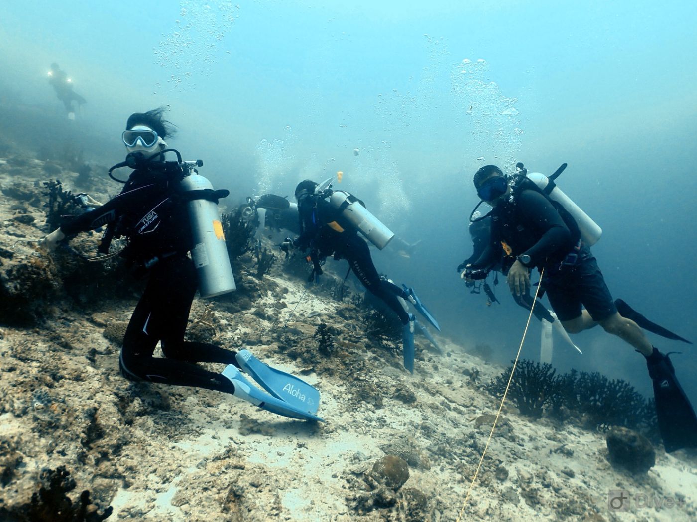 ซึ่งแผนนี้นั้นเราจะลงน้ำไปพร้อมกันหมด โดยมีไดฟ์หลีดว่ายอยู่ตรงที่ตื้น ตรงกลางๆ และลงไปลึกๆ พวกเราก็บุ๋งๆอยู่ตรงกลางไปเรื่อยๆ ไดฟ์หลีดจะคอยดูว่าเจอไหม ถ้าเจอก็ว่ายเข้าไป ระวังอย่าตัดหน้าน้อง ระวังหาง และอย่าแตะตัวน้องนะเออ เอาล่ะ ไปลงเรือได้ เฮ!