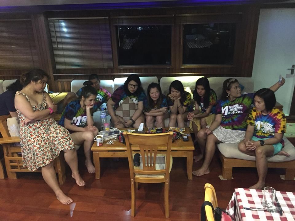 ท้ายที่สุดแล้ว ฝนก็ตกลงมาหนักมากจนขึ้นไปปาร์ตี้บนเกาะไม่ได้จ้า ฝนฟ้าคะนองกระจายเหลือเกิน ซึ่งในความโชคร้ายที่ไม่ได้ขึ้นเกาะก็เป็นความโชคดี เพราะคืนนี้เป็นคืนวันพุธและบุพเพสันนิวาสฉายเป็นตอนสุดท้ายพอดี๊ เลยตั้งเป็น #ทีมดูสดมัลดีฟส์ กัน เป็นแก๊งไดฟ์เวอร์ติดละครเด้อออออ