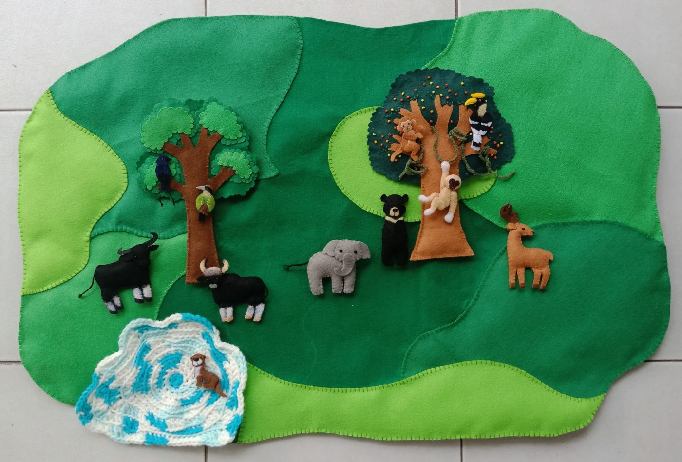 ส่วนสัตว์ตัวอื่น ๆ ที่เราทำเพิ่มมา คือ นกเงือก กวางป่า ชะนี หมีควาย ช้าง จากป่าดิบ ส่วนป่าเต็งรังมีนกแซงแซวหางบ่วงใหญ่กับนกหัวขวานเขียวตะโพกแดง ส่วนที่ยากของการทำสัตว์คือ การพยายามทำให้สีขนของพวกมันสมจริงมากที่สุด โดยเฉพาะพวกสัตว์บนต้นไม้ที่เราใช้เทคนิคจิ้มขนเฟลต์ เพิ่มสีสันลงบนผ้าสักหลาด แรก ๆ สนุกนะ แต่จิ้มไปก็เริ่มท้อ เพราะขนไม่ติดกับผ้าสักที เพราะเราต้องการให้ของเล่นทุกชิ้นของเราแข็งแรงที่สุด ต่อให้เด็กกระชากมันก็ห้ามหลุด ก็เลยเสียเวลาไปเยอะหน่อยกับการเย็บสัตว์แต่ละตัวให้แข็งแรง