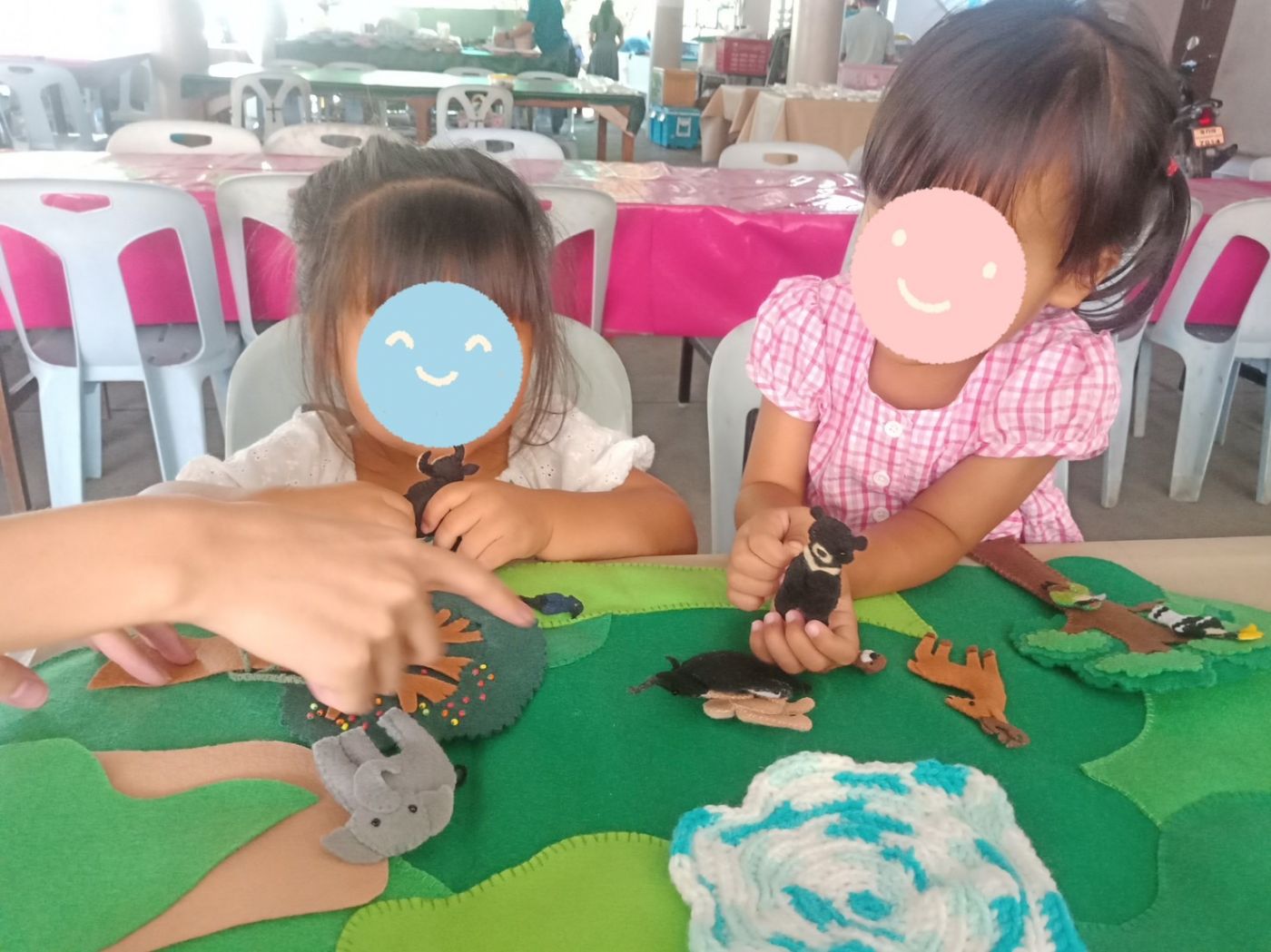 ต่อมาเราได้ทดลองกับเด็ก 5-7 ปี ซึ่งเป็นกลุ่มเป้าหมายหลัก กลุ่มแรกเป็นเด็กโตหน่อย อายุ 7-10 ปี น้องก็สนใจและเล่นของเล่นเรา ซึ่งจะเล่นบทบาทสมมติเป็นสัตว์ต่าง ๆ หลังจากเล่นมาสักพัก เราก็ลองให้ข้อมูลเกี่ยวกับป่าและที่อยู่อาศัยของสัตว์ดู ปรากฏว่าน้องเข้าใจและแยกประเภทสัตว์ได้ถูกตามที่เราบอกเลย แล้วน้องก็แนะนำว่าน่าจะมีแมลงด้วย อย่างจั๊กจัน เพราะพ่อเขาเลี้ยงจั๊กจั่น