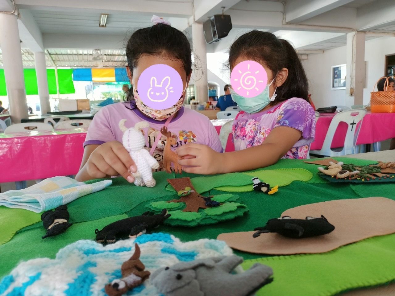 ตอนแรกเรากังวลว่าของจะชิ้นเล็กไปสำหรับเด็กรึเปล่า แต่ครูปรึกษาที่น่ารักของเราก็บอกว่า มาตรฐานของเล่นสำหรับเด็กเล็ก ต้องมีขนาดอย่างน้อย 3 เซนติมเตร ซึ่งของเล่นเราอย่างนาก หรือนก ขนาดใหญ่กว่านั้นนิดเดียว เราก็ยังกลัวว่าถ้าเด็กเล็กมาเล่น เขาจะจับไม่อยู่ หรือทำของเราหล่นง่าย โชคดีที่มีโอกาสได้ทดลองกับเด็ก 2-3 ขวบ ซึ่งน้องถือได้ไม่มีปัญหา มีน้องคนหนึ่งชอบนกเงือกมาก พอเอาลิงมาโชว์น้องก็พูดขึ้นมาเลยว่า "Monkey" เพราะแม่ชอบพาน้องไปสวนสัตว์ น้องเลยสนใจตุ๊กตาสัตว์