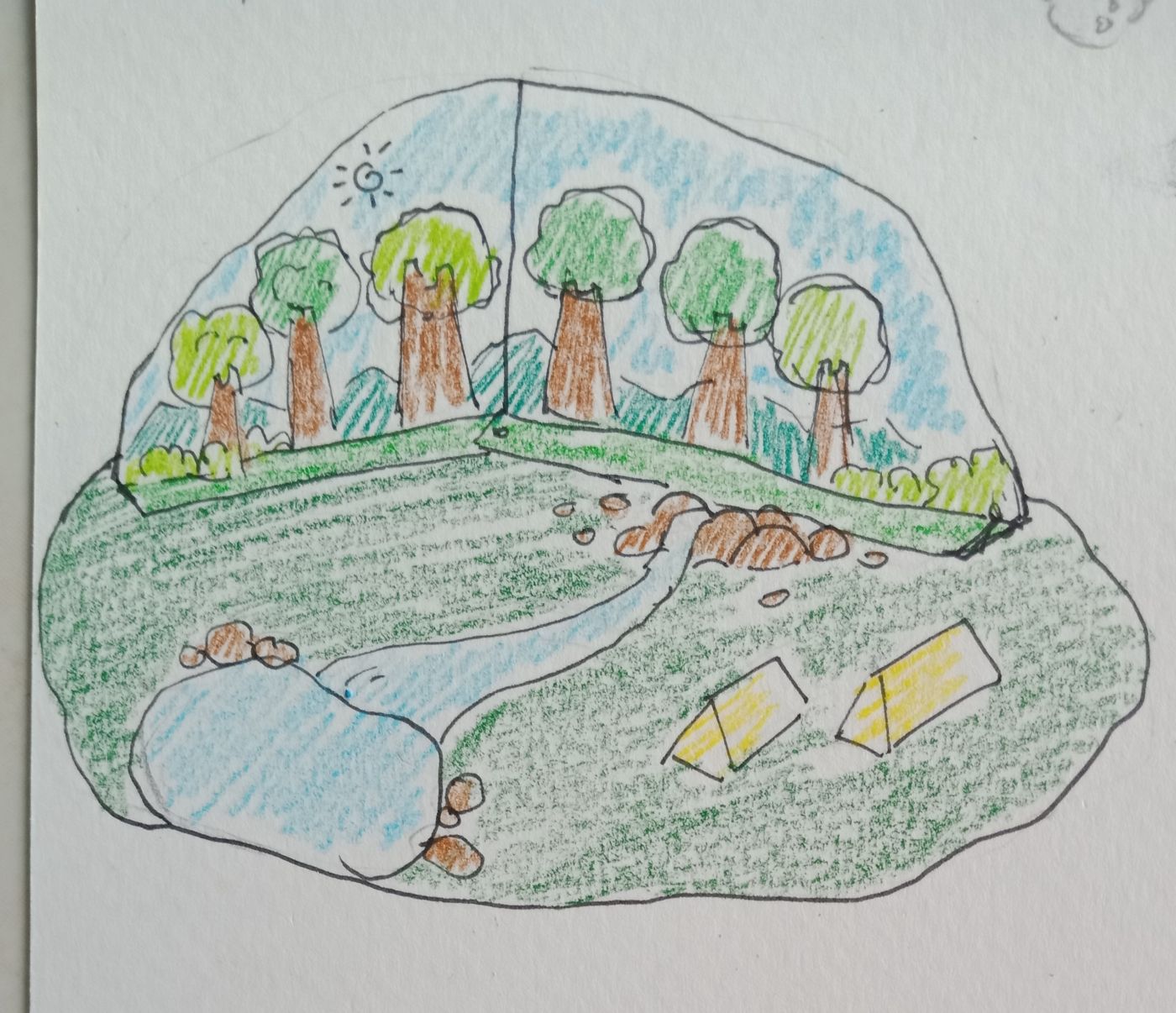 กระเป๋าไม่ได้แล้ว เลยออกมาเป็นผืนผ้าที่มีฉากตั้งขึ้นมา เป็นฉากป่าตอนกลางวันที่มีทั้งป่าดงดิบและป่าเต็งรัง ส่วนตอนกลางคืนก็เป็นฉากดูดาว มีแม่น้ำสายเล็ก ๆ ไว้เล่น ก็เหมือนเอาแบบที่ทำกระเป๋ามาปรับเป็นผืนผ้าแทน ครูที่ปรึกษาก็โอเค ถ้าหากระเป๋าไม่ได้ก็ทำแบบนี้แทนก็ได้