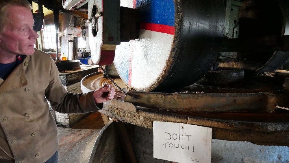 เกษตรกรกำลังสาธิตการทำงานของกังหัน พร้อมทั้งบดเมล็ดพืชได้ในเวลาเดียวกัน