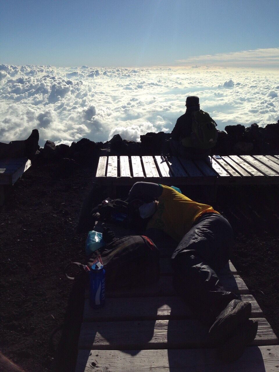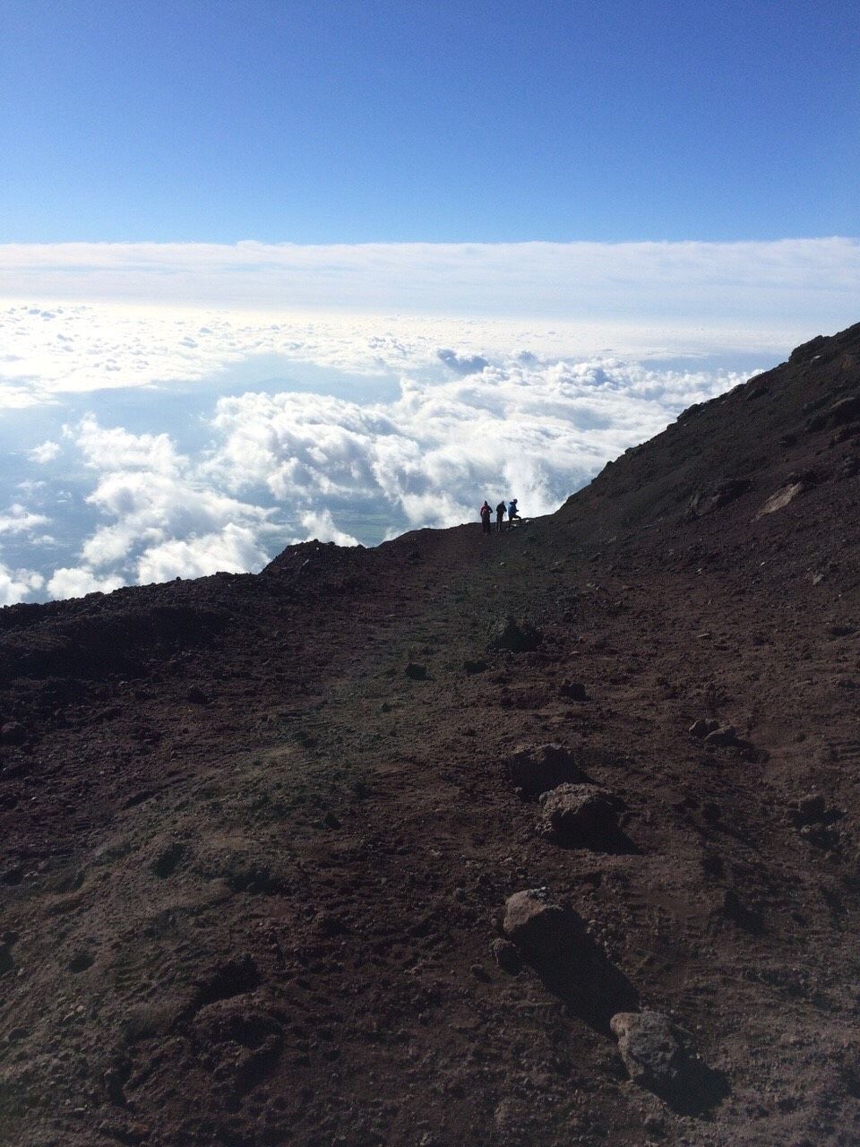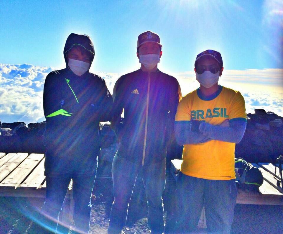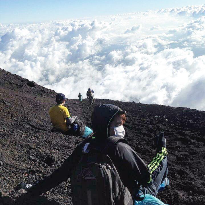 อีกประมาณ 200 เมตรเราก็จะถึงยอดเขาที่ตั้งใจไว้ แต่ด้วยพละกำลังตอนนี้ แค่ยกเท้าก้าวยังไม่ไหว เราจึงใช้วิธีเดินสามก้าวหยุด เดินสามก้าวหยุด แบบนี้ไปเรื่อยๆ ซึ่งความรู้สึกตอนนี้มันบอกไม่ถูก ไม่สามารถบรรยายได้ มันเหนื่อย มันล้า มันท้อ คำถามมากมายเกกิดขึ้นบนหัวของผม แต่ในที่สุด พวกเราก็สามารถฟันฝ่าความรู้สึก สภาพร่างกายที่ไร้กำลัง ฝืนพาตัวเองขึ้นมาถึงยอดภูเขาไฟฟูจิได้
