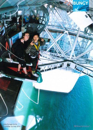 หลังจากเจ้าหน้าที่ได้แนะนำขั้นตอนต่างๆ อย่างละเอียดเพื่อความปลอดภัยขั้นสูงสุด กลุ่มของเราก็เริ่มเดินทางจากตีนสะพานตามทางไปเรื่อยๆ ยิ่งเดินยิ่งสูง ยิ่งเดินยิ่งสูง สูงเรื่อยๆ อาการของผมเริ่มออกครับ คือมือเริ่มสั่น หัวใจเต้นแรง พร้อมกับเสียงรถเคลื่อนที่ผ่านด้านบนสะพาน ดังตึงๆ แต่ก็ต้องรักษาหน้าชาวไทยไว้หน่อย ในที่สุดเมื่อเดินมาถึงจุดกระโดด เจ้าหน้าที่ก็เรียกชื่อทีละคนๆ คนแรกคือชาวอเมริกัน ซึ่งระหว่างเดินผมได้พูดคุย ก็ได้รู้ว่าคนอเมริกันคนนี้เป็นนักกระโดดบันจี้จัมพ์มืออาชีพ ซึ่งเขาบอกว่าเดินทางไปทั่วโลกเพื่อกระโดดบันจี้จัมพ์ และสำหรับที่ Auckland ยังไม่ใช่ที่สุดของบันจี้จัมพ์ ถ้าให้หวาดเสียวที่สุดต้องไปที่ Bungy Jumping & Canyon Swings Queenstown เมือง Queenstown อยู่ทางตอนใต้