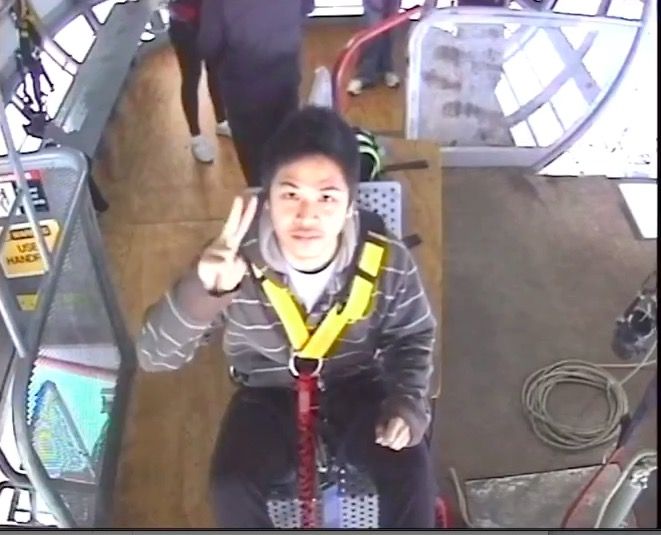 นี่แค่ธรรมดานะ ทำไมผมเริ่มหวั่นๆ กลัวๆ อย่างบอกไม่ถูกครับ อาการที่ไม่สามารถบรรยายได้ ทั้งกลัว ทั้งเสียดายตังค์ เมื่อคนแรกชาวอเมริกันขึ้นไปนั่งเตรียมผูกเชือกที่ข้อเท้าทั้งสอง หัวใจผมยิ่งเต้นแรงขึ้นไปอีก เพราะคิวต่อไปคือผมเอง ผมมองสังเกตคนแรกอย่างไม่กระพริบตา (จำชื่อไม่ได้) ทุกขั้นตอนพยายามจำให้ได้ เมื่อชาวอเมริกันก้าวเท้าลงมาไปยังบริเวณขอบทาง หรือจุดที่เราต้องกระโดด เจ้าหน้าที่บอกว่าให้มองไปที่กล้องเพื่อถ่ายภาพเท่ๆ ก่อนจะกระโดด จากนั้นนับ 1-3 ไม่ทันถึง 3 มันกระโดดพุ่งลงไปยังกับกระโดดสระว่ายน้ำ ไม่กลัวอะไรทั้งนั้น ทุกสายตามองตามลงไปยังข้างล่าง เวลาเพียงเสี้ยววินาทีก็ถึงด้านล่าง จากนั้นเจ้าหน้าที่จะดึงเชือกขึ้นมา(ใช้เครื่องดึงนะ) สำหรับคนที่กระโดดลงไปให้กระตุกเชือกที่ข้อเท้าเพื่อพลิกตัวกลับมาตำแหน่งเดิม ไม่ให้ห้อยหัว จากนั้นผมก็ได้ยินเสียง "Who's next" ผมก็ยกมือแล้วก็เดินขึ้นไปบนแท่นนั่ง สำหรับผูกข้อเท้า ณ ตอนนี้ อาการต่างๆ กลับมาอีกครั้ง กลัว ตื่นเต้น อยากตะโกนออกมาเป็นภาษาไทย ท้องไส้ปั่นป่วนไปหมด เจ้าหน้าที่ก็บอกวิธีต่างๆ เพื่อความปลอดภัย ถึงเวลาของผมแล้ว "step forward" เจ้าหน้าที่บอกกับผม