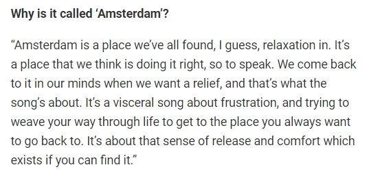 ทำไมถึงตั้งชื่อเพลงนี้ว่า 'Amsterdam' ล่ะ? - Amsterdam เป็นที่ที่พวกเรารู้สึกค้นพบน่ะครับ ประมาณว่า อยู่แล้วรู้สึกผ่อนคลายสบายใจ เป็นที่ที่แบบ เราคิดว่าจะแสดงมันออกมาให้ถูกต้อง ก็คือบอกมันออกมา(ผ่านเพลง) เรากลับมาคิดถึงมันอีกครั้งเมื่อเราต้องการที่จะผ่อนคลาย และเพลงนี้ก็ตั้งใจจะสื่อแบบนั้น เป็นเพลงที่เค้นออกมาจากภายในเลยว่า มันเกี่ยวกับความท้อแท้ ไม่พอใจ และความพยายามหลบหลีกหนีมันผ่านเส้นทางชีวิตที่นำไปสู่ซักที่ ที่คุณมักจะสบายใจเมื่อได้กลับไปน่ะ ง่ายๆก็เหมือนกับหาทางปลดปล่อย หาทางปลอบใจในการมีชีวิตอยู่เวลาที่เจอเรื่องยุ่งยาก