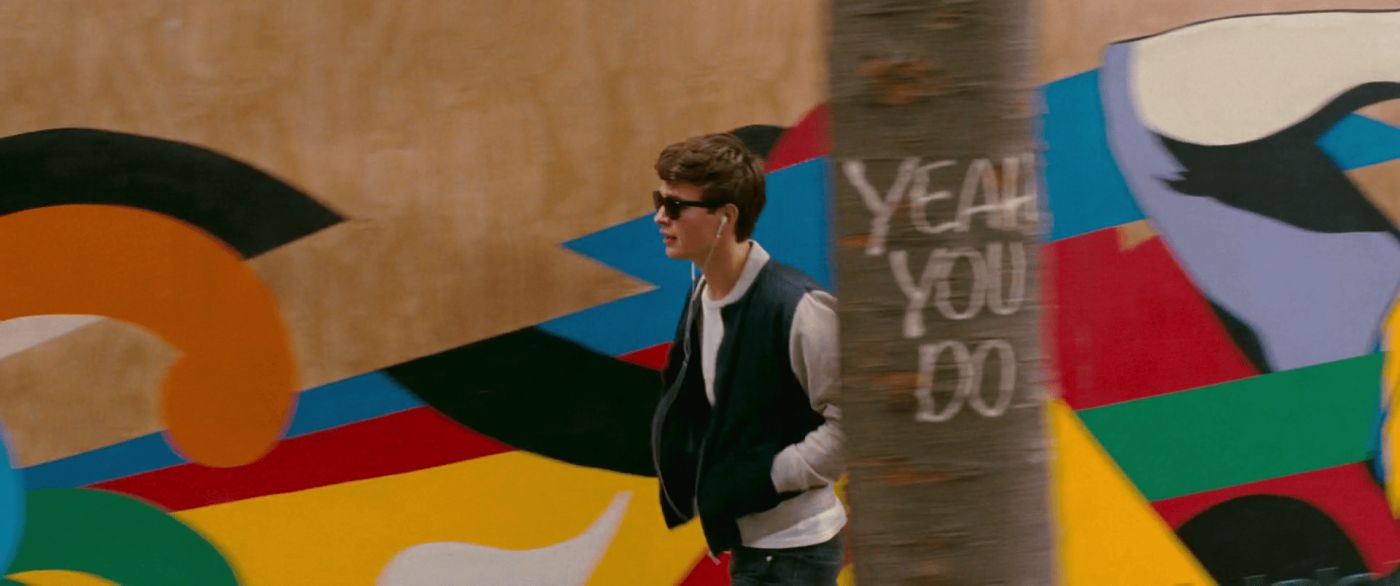 มีฉากนึงที่ Baby ยืนอยู่ในร้านกาแฟ แล้วข้างหลังมีภาพวาดเล็ก ๆ บนกำแพงนอกร้านกาแฟเป็นหัวใจสีเทา กล้องแพนไปที่ Debora (เล่นโดย Lily James) (ซึ่ง ณ จุดนี้คนดูยังไม่รู้ด้วยซ้ำว่าเธอเป็นนางเอกของเรื่อง) พอกล้องแพนกลับมาภาพวาดหัวใจนั้นกลายเป็นสีชมพู