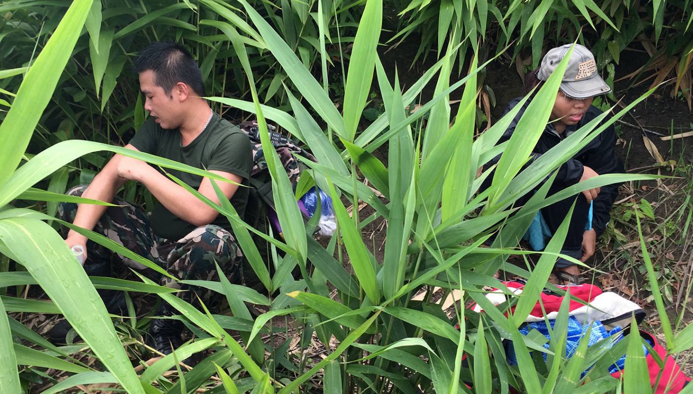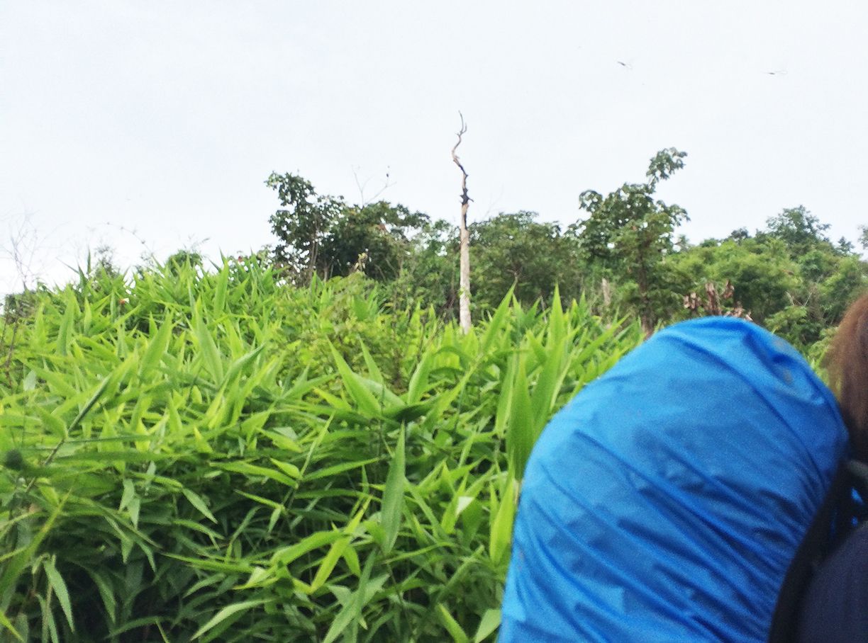 เราก็เดินตามพี่ทหารขึ้นไปเรื่อยๆ พยายามเดินตามให้มากขึ้นเพราะของที่แบกไว้เหลือแค่เป้ของเรา ซึ่งเราก็คิดถ้าไม่มีพี่ทหารมาช่วย เราจะไปต่อยังไง ตอนแรกที่หยุดเพราะหนัก ยังคิดให้คนอื่นไปก่อนเลยไม่ต้องรอเรา แต่ถ้าทำแบบนั้นเราหลงป่าแน่นอน เราก็เดินตามคนอื่นๆ ไปเรื่อยๆ หยุดพักบางครั้ง นานเข้าก็ถามพี่ทหารว่าอีกไกลแค่ไหน พี่ทหารก็บอกถ้าเห็นต้นไม้ขาวก็แปลว่าใกล้ถึงแล้ว เราก็เดินไปเรื่อยๆ พี่ทหารก็เดินนำโด่งไปกับพวกที่นำหน้าไป ไปไกลลิบจนเราไม่เห็น เราก็เดินไปกับพี่เจ้าของทริปและเพื่อนผู้หญิงอีก 2 คน จนมาถึงดงกอไม้หนึ่งซึ่งเราไม่รู้เรียกอะไรแต่เป็นใบยาวๆ และแหลมๆ และที่น่าตกใจคือทางชันมาก แบบดิ่งขึ้นไปเลย และใบของต้นไม้ยาวๆ นั่นก็สูงท่วมหัว แต่ไม่มีทางเลือก เราก็ต้องขึ้นไป ก็มีเสียงคนที่เดินนำหน้าที่เราไม่เห็นดังแว่วๆ มา ส่วนต้นไม้ขาวก็เห็นลิบๆ ไกลๆ ตอนแรกเราคิดว่าต้นนี้แหละที่ทหารบอก แต่พอเดินต่อไปจนถึง ถึงจะรู้ว่าไม่ใช่ต้นไม้ขาวต้นนี้ที่ว่าเป็นต้นก่อนถึงจุดกางเต๊นท์ เราก็เดินลุยผ่านดงใบไม้ยาวนี้ไป พยายามตระกายเดินขึ้นไป มีใบ้ไม้บาดบ้างแต่เราไม่สน มีหลายจุดที่ดึงใบไม้เหนี่ยวตัวขึ้นไปแบบกระชากเลย ความจริงเรามีถุงมืออยู่แต่ก็ไม่ได้นำออกมาใช้ คิดว่าไม่เป็นไร บาดนิดเดียว แต่วิวสวยมากถ้ามองลงไป แต่ถึงวิวสวย เราก็ไม่มีโอกาสชื่นชมมาก เพราะเหนื่อยมากและอยากไปให้ถึงจุดกางเต๊ํนท์เร็วๆ จนมาถึงจุดหนึ่ง เห็นคนในทริปที่เดินนำมาก่อนตั้งนานมองลงมา ตอนแรกคิดว่าจะถึงแล้ว เพราะตอนนั้นไม่รู้จะถึงเมื่อไหร่จริงๆ และเดินมานานมาก ขึ้นเขามา พอเห็นคนนั้นมองลงมาก็แอบคิดว่าเอ๊ะหรือถึงแล้ว เลยกัดฟันทั้งที่เหนื่อยมากขึ้นไปให้ถึง แต่พอถึงจริงๆ ถึงรู้ว่าถ้ามีที่โล่งเล็กๆ มากๆ ที่นั่งได้แค่นั้น แต่เราก็ทิ้งตัวลงไปเลย เพราะเหนื่อยมาก ส่วนคนที่เดินนำไปก่อนที่ได้มาพักก่อนก็เดินทางต่อ แต่เราไม่ไหวเลยไม่ได้ตามพวกเขาไปทันที ก็อยู่กับพี่เจ้าของทริปและผู้หญิงอีก 2 คนที่เดินมาพร้อมเรา เหนื่อยสุดๆ