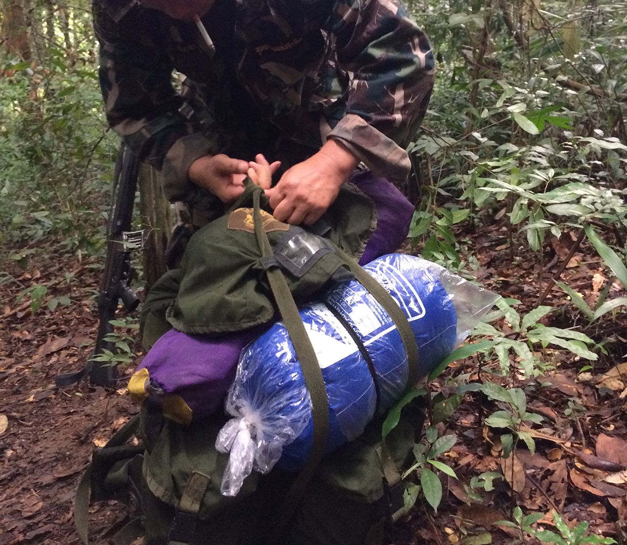 นั่งรถกระบะไปสักพัก ก็มาถึงจุดที่จะเริ่มออกเดินทางขึ้นเขากัน เราลงรถมาได้ก็รีบมาผูกเต๊นท์กับถุงนอนเข้ากับกระเป๋าเป้ของเรา โดยขอเชือกจากคนร่วมทริปมาผูก แต่เพราะเราไม่เคยเดินทางแบกเต๊นท์ขึ้นเขามาก่อน ซึ่งค่อนข้างหนัก เราไม่แน่ใจจะผูกอยู่หรือเปล่า เลยขอให้พี่ทหารที่จะนำทางมาช่วยผูกให้มันอยู่เพราะเราไม่สามารถหอบแบบหนีบหรือกอดขึ้นไปได้ เมื่อเสร็จเรียบร้อยเราก็แบกเป้เตรียมพร้อมออกเดินทางแต่รู้ตอนนั้นเลยว่า "มันหนักมาก"