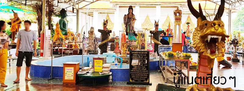 เข้ามาก็เจอศาลาคนถวายสังฆทานและมีโลงแก้วของเด็กชายคนหนึ่ง วัยรุ่นเดินผ่านแล้วยกมือไหว้ เราก็สงสัยเลยจะเดินเข้าไปอีกนิด ด้อมๆ มองๆ ดู เปิด Google หาข้อมูลเจอว่าเป็นศพเด็กที่ไม่เน่าเปื่อยเสียชีวิตตั้งแต่ปี พ.ศ. 2520 แล้วอยู่ๆ เราก็รู้สึกกลัวขึ้นมา เลยล่าถอยออก เดินเข้าไปด้านในก็เจอลานที่มีรูปเคารพมากมายอย่างองค์เจ้าแม่กวนอิม เราก็ยกมือไหว้แล้วเดินอ้อมออกไปเพื่อหาว่าศาลาของ "ย่านาค" อยู่ตรงไหน