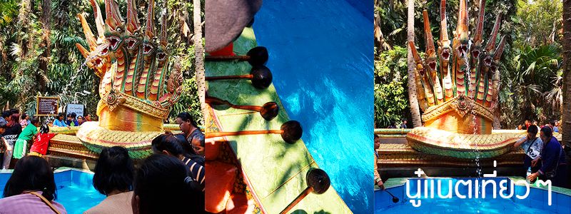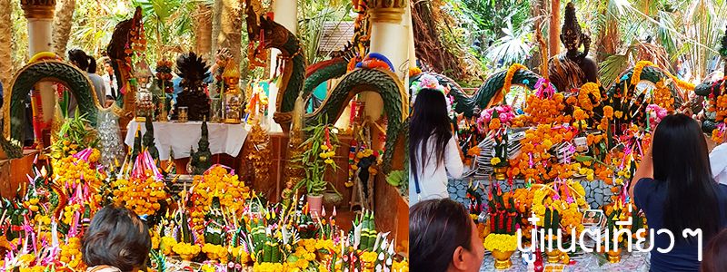เราเห็นเจ้าของทริปไม่ได้ไปต่อแถวแค่ไปยืนริมศาลาของ "พ่อปู่ศรีสุทโธ แม่ย่าศรีปทุมมา" ด้านหนึ่งแล้วแค่ยกมือไหว้ เราก็ไม่รู้จะไหว้ที่ไหนก่อน เจอรูปเคารพสิ่งศักดิ์สิทธิ์ก็ยกมือไหว้ แล้วเดินไปที่สระที่มีีรูปปั้นองค์พญานาคใหญ่ มีคนรายล้อมมากมาย เอาน้ำรดศรีษะก็มี เราก็ทำตาม