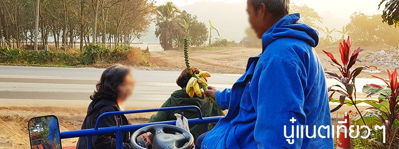 ตอนมาถึงทางออกด้านล่าง คนขับรถอีแต๋นก็หยุดรถ แล้วเดินไปหยิบกล้วยหวีหนึ่งให้คุณป้า 2 คนด้านหน้า