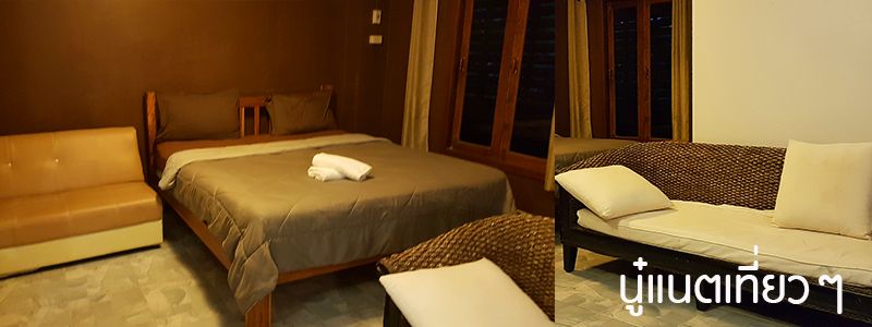 ห้องเราอยู่แยกกับห้องคนอื่นแบบเดินไปคนละทาง แต่หน้าห้องมีเก้าอี้หวายทรงไข่แบบแขวน มีชิงช้า ก็น่ารักดี ชอบชอบ เปิดประตูห้องเข้าไปคือห้องใหญ่มาก แบบห้องครอบครัว มี 2 เตียงใหญ่ ห้องน้ำ 1 ห้อง มีโซฟายาว 2 ตัว พี่อีกคนเข้าไปจองเตียงด้านใน เราเลยนอนเตียงด้านนอก ซึ่งตอนแรกๆ เหมือนแอร์ไม่ตก เลยร้อนๆ ไงไม่รู้