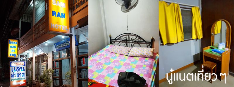 มื้อแรกมีความแตกต่างทางด้านราคาอาหารหลากหลาย เลยตกลงจ่ายของใครของมันก่อน เจ้าของทริป ก็ถามมีใครอยากอาบน้ำไหม ซึ่งเราเป็น 1 ในนั้นอย่างแน่นอนเพราะเหนียวตัวมาก ตอนแรกเจ้าของทริปไปถามโรงแรมฝั่งตรงข้ามร้านประมาณขออาบน้ำหรือจ่ายค่าห้อง 1 ห้อง แต่จำไม่ได้ว่าอาจจะแพงไป ลูกทริปบางคนอาบน้ำมาก่อนออกจากบ้านแล้วเมื่อคืนก็ไม่อาบน้ำอีก ส่วนบางคนอยากอาบน้ำก็เลยเดินตามเจ้าของทริปหาโรงแรมที่ราคาไม่แพงเพื่ออาบน้ำ จนมาได้ห้องที่ "โรงแรมแสนสำราญ" ไม่ทราบราคาเท่าไหร่เพราะจ่ายเงินกองกลาง