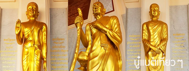 เมื่อไหว้พระทำบุญเสร็จแล้วก็เดินดูรอบๆ อุโบสถ ก็มีรูปหล่อของพระองค์สำคัญของพระพุทธศาสนาหลายองค์รอบอุโบสถพร้อมประวัติความสำคัญของพระแต่ละองค์