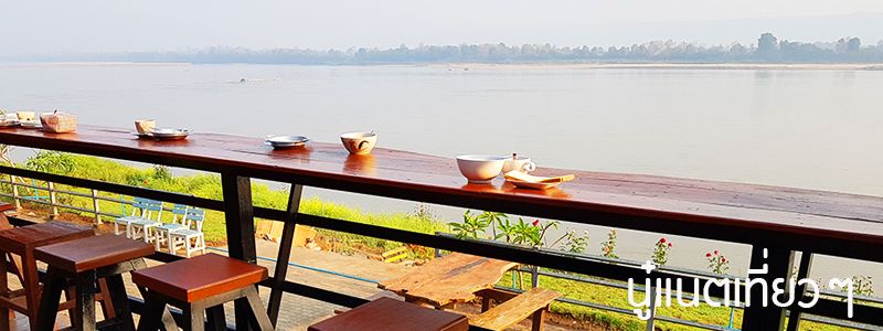 ซึ่งพอเดินไปด้านหลังตรงที่ทานอาหาร จะเจอบรรยากาศแม่น้ำโขงที่สวยงาม ที่นั่งชิล แบบทานอาหารไปชมวิวแม่น้ำโขงไป