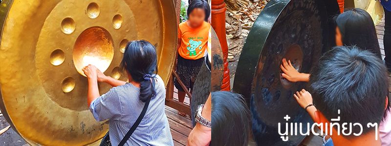 เมื่อไหว้ขอพรสิ่งศักดิ์สิทธิ์แล้ว ก็เดินอ้อมไปด้านหลังอีกนิดก็เจอฆ้อง 2 อันที่มีคนมาลูบ เชื่อกันว่าถ้าลูบแล้วเสียงดังจะขอพรได้สัมฤทธิ์ผล เราก็เลยต่อแถวรอลูบฆ้องขอพรบ้าง