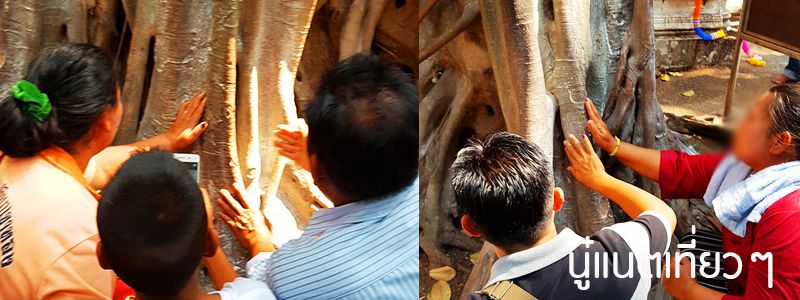 พอมาถึงจุดที่จะเข้าไปไหว้ "พ่อปู่ศรีสุทโธ แม่ย่าศรีปทุมมา" คนก็เยอะพอสมควร คือแถวยาวเลยล่ะต้นไม้ใหญ่ต้นหนึ่งบริเวณนั้นก็มีคนมาขูดหาหวยหลายคนเหมือนกัน