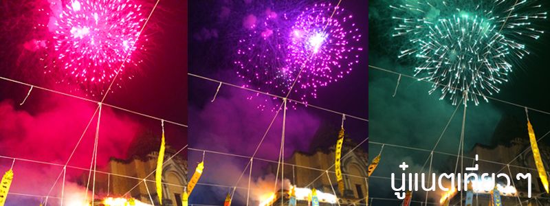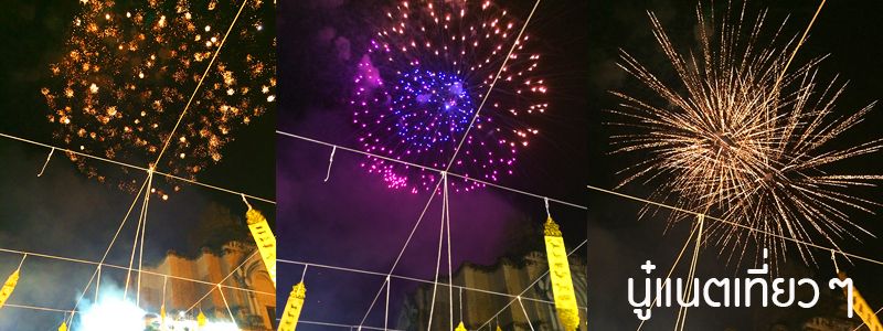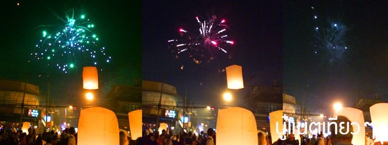 ยืนมองและถ่ายภาพคนจุดโคมลอยและโคมลอยที่ลอยไปบนฟ้าเรื่อยๆ สักพักพลุก็ถูกจุดขึ้น ก็เลยได้ถ่ายภาพโคมลอยกับพลุบนฟ้า ชั่วโมงแห่งการเฉลิมฉลองใกล้เข้ามาแล้ว ตอนนั้นประมาณ 2 ทุ่มกว่า