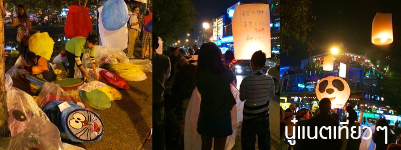 วันนี้เห็นคนมาขายโคมลอยและลอยโคมกันเยอะ ก็เดินดูไปเรื่อยๆ เห็นมีแบบตัวการ์ตูนหรือมีข้อความเขียนอยู่บนโคมลอยด้วย