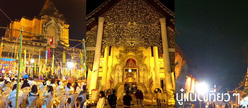 วัดที่มาไหว้พระทำบุญนี้คือ "วัดเจดีย์หลวงวรวิหาร" ตอนบ่ายๆ มาแล้ว ตอนนี้ก็มาอีก ไหว้พระวนไปเรื่อยๆ เดินไปตรงที่เขาวางเก้าอี้ให้คนมาสวดมนตร์ข้ามปีก็เริ่มมีคนมาจับจองที่นั่งกันบ้างแล้ว โคมก็ลอยเต็มฟ้าเห็นได้ลิบๆ จากในวัด