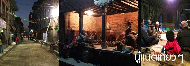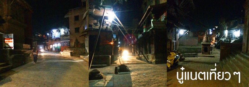 การเดินทางกลับที่พัก คือทางของพี่ไปอีกไกล ทางของเราก็ดูมืด แม้มาเมืองนี้ครั้งแรก แต่เพราะตอนบ่ายเดินไปมา เลยพอรู้เส้นทางไป "Bhaktapur Durbar Square"  ว่ามีอย่างน้อย 2 ทาง คือทางที่ผ่านซากปรักหักพังกับผ่านทางตรอกแห่งหนึ่งแล้วออกสู่ถนนหลัก ซึ่งใกล้ที่พักเรามาก เราเลยเลือกเดินไปทางตรอก ซึ่งตอนกลางวันจำได้ว่าขายผ้าแขวนๆ ผืนใหญ่ แต่พอกลางคืนก็มืดแล้ว ช่วงที่มืดมากๆ แม้ทางไม่ไกล เราก็เปิดอัดคลิปมือถือพูดกับตัวเอง คือไม่ว่าที่ไหนบนโลกจะมีทั้งคนดีและไม่ดี เราไม่ได้ว่าใครไม่ดี แต่เรามาเดินคนเดียวมืดๆ ในทางที่ไม่คุ้นเคยก็ต้องกลัวบ้าง ตอนนั้นก็คิดส่งเสียงพูดกับตัวเองหรือเดินเงียบๆ ดี ตอนนั้นไม่มีเนต แบบจะ live ผ่าน FB แบบคิดไปเอง live ไป เกิดมีไรเกิดขึ้นจะได้มีเบาะแส 555 แต่พอเดินในตรอกมืดๆ ถ้ามาย้อนดูจากคลิป จะเห็นมีคนเดินสวนมาเหมือนกัน และพอออกจากตรอกมืดๆ ซึ่งเป็นทางไม่ไกลก็ออกมาสู่ทางหลักที่ยังพอมีแสงสว่างจากร้านค้าที่ยังเปิดอยู่บ้าง