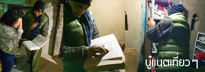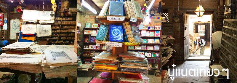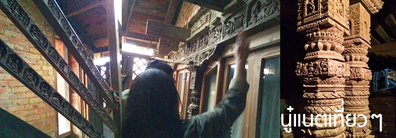 พอดูงานแกะสลักแล้ว เจ้าของก็พาเรา 2 คนไปห้องนึง เพื่อดูหนังสือที่เขาเก็บไว้ ส่วนนี้ก็ไม่แน่ใจว่าเขาบอกว่าเขาเป็นอาจารย์มาก่อนหรือเปล่า แต่ที่แน่ๆ เขาสนใจเกี่ยวกับ "พระพุทธศาสนา" มากๆ และเขาเป็นญาติกับเจ้าของ "Peacock Guest House" ด้วยมั้ง แต่ห้องที่เขานำไป ไม่ว่าจะเป็นเสาหรือขื่อด้านบนมีแต่รอยแกะสลักที่ปราณีตละเอียดสวยงามแบบต้องใช้เวลาทำนานแค่ไหนเนี่ย