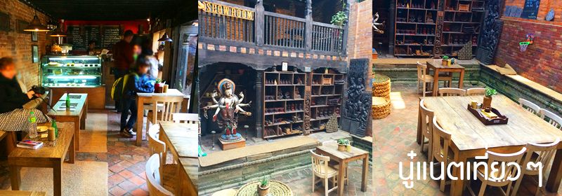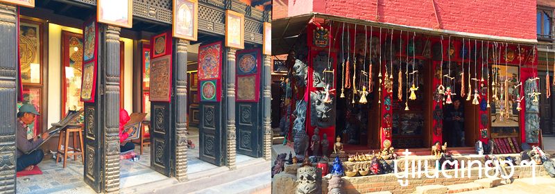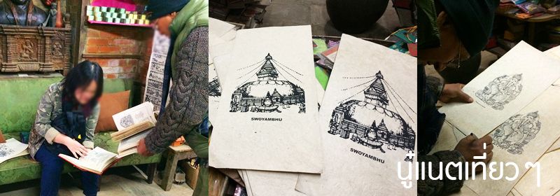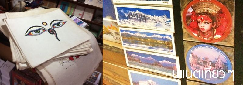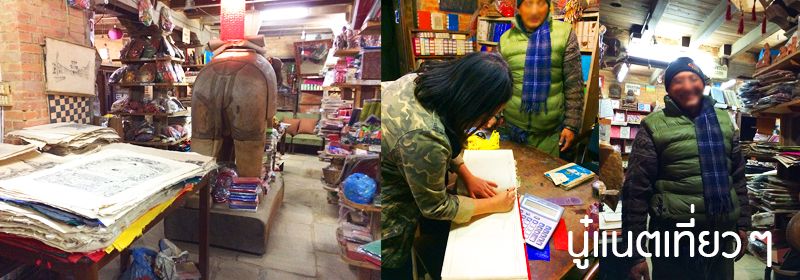 เดินดูรอบๆ ร้านก็มีที่ปั๊มไม้แกะสลักอยู่เต็มชั้น, มีธงเล็กๆ ด้วย ส่วนภาพพิมพ์บนกระดาษก็เยอะ (มีลายไม่ได้เยอะมาก แต่ดูลายแล้วรู้เลย "เนปาล") เราสนใจภาพพิมพ์บนกระดาษเพราะยังไม่มีของฝากให้ครอบครัว, ญาติสนิทหรือเพื่อนที่ยังคบอยู่ สอบถามราคาแล้วโอเคเลย ซื้อได้ เลยยืนเลือกจะเอาภาพไหนดี ก็คิดก่อนว่าจะฝากใครบ้างจะได้ซื้อถูกจำนวน ส่วนพี่ก็ไปนั่งโซฟา คุยกับเจ้าของร้าน ถ้าดูจากในรูปเจ้าของร้านหยิบหนังสือเล่มหนาออกมายืนคุยกับพี่เขาด้วย คือเราโง่ภาษาอังกฤษ ส่วนใหญ่คุยอะไรกัน พี่เขาเป็นคนคุย เราชอบถ่ายภาพเก็บความทรงจำมากกว่า