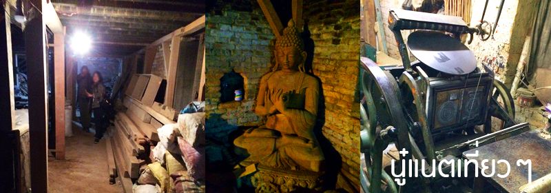 พอดูหนังสือเสร็จแล้ว เจ้าของก็พาเดินไปในส่วนต่อไป ก็ไม่รู้ส่วนไหนเหมือนกัน แต่ของก็รกอยู่ มืดด้วยแต่มีงานฝีมือพวกเสาไม้แกะสลักหรือพระพุทธรูปไม้ ก็ถือว่าเดินสำรวจ ความจริงตอนเดินเข้ามา มีป้ายบอกว่าที่นี่เป็นโรงงานกระดาษ