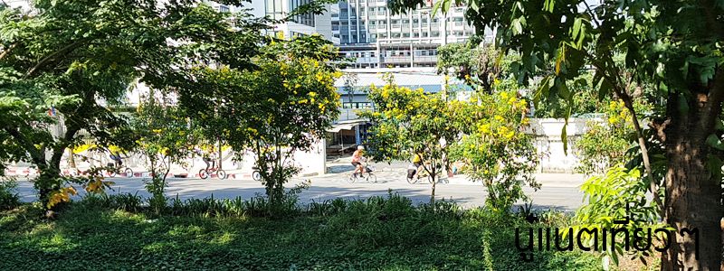 นั่งมองออกไปนอกหน้าต่างรถไฟ...จุดหนึ่งก็เจอคนมาปั่นจักรยานกันไปตามถนนที่โล่ง