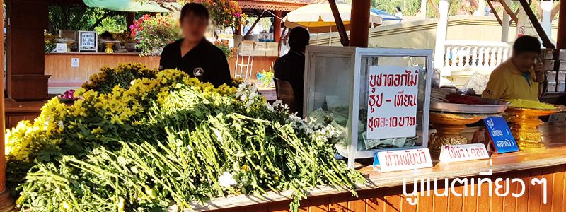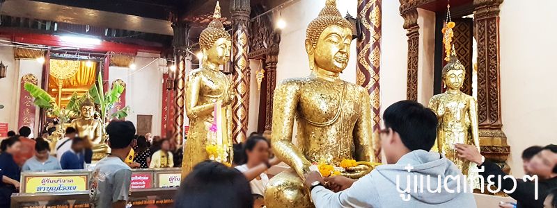 คนก็ไหว้กันเยอะอาจเพราะเป็นวันหยุดด้วย...เราที่ใส่ขาสั้นมาก็ต้องไปเปลี่ยนกางเกงก่อนเข้าโบสถ์...แต่ถ้าข้างหน้านี้คงยังใส่ขาสั้นไหว้ได้ก็เลยตัดสินใจไหว้ก่อน...แต่ตอนวางดอกบัวก็ไม่แน่ใจให้เอาไปไหว้ด้านในหรือวางแถวนี้...ตอนแรกหาไม่เจอ...แต่สุดท้ายเจอที่เขาวางดอกบัวกันก็จะเอาไปวาง...แต่มีคุณป้า 2 คนมาหยิบดอกบัวออกจากที่วางก็เลยให้เขาหยิบให้เสร็จก่อน...ส่วนแผ่นทองแปะพระที่เราได้มา...ไม่รู้ว่าไปแปะพระพุทธรูปตรงไหนก็เลยใส่กระเป๋าเสื้อไว้ก่อน