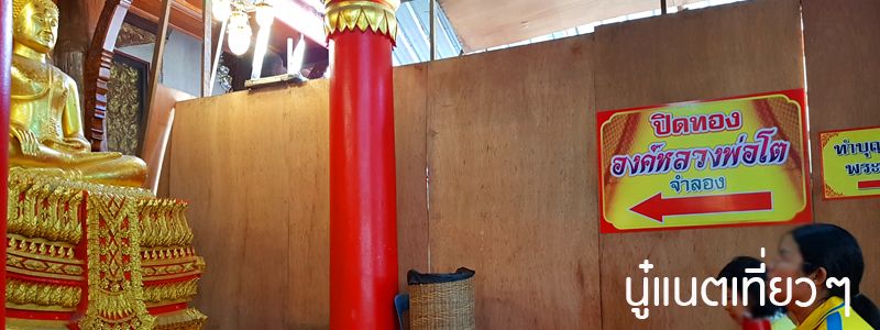 เดินเลี้ยวขวาไปตามทางแล้วเลี้ยวซ้ายอีกทีจะถึงหน้าโบสถ์..ซึ่งด้านหน้าก็จะมีองค์พระพุทธรูปสำหรับให้แปะแผ่นทอง...ซึ่งที่เราได้มามี 3 แผ่น