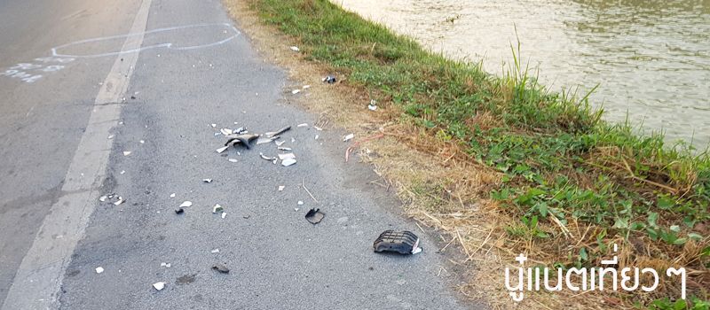 เดินมาไม่ไกลก็เจอเศษอะไรพวกนี้บนถนนก็ไม่แน่ใจเกิดอุบัติเหตุรถชนกันรึเปล่า...มีรอยขีดบนถนนด้วย