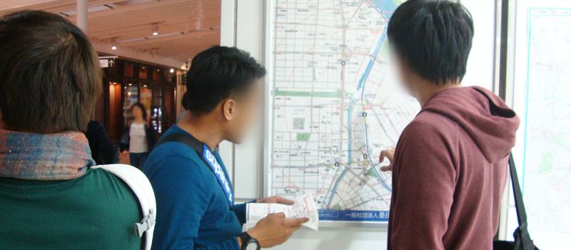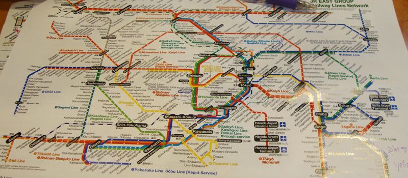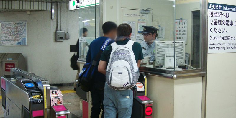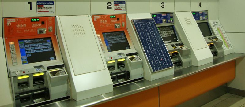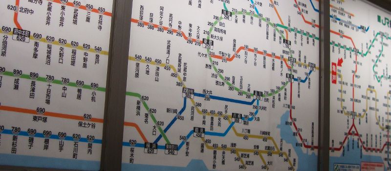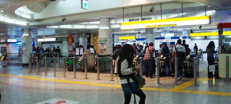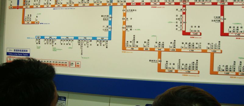 เดินทางมาที่สถานีรถไฟใต้ดิน ชื่อแต่ละสถานีเป็นภาษาญี่ปุ่น และมีราคาแต่ละสถานี