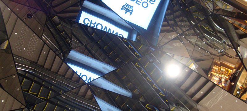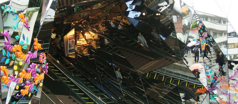 ตรงด้านบนบันไดเลื่อนจะเป็นกระจกที่ถูกจัดเป็นแบบต่อๆ กันเป็นเหลี่ยม..มุม...ภาพสะท้อนที่ปรากฏเลยดูแปลกตา