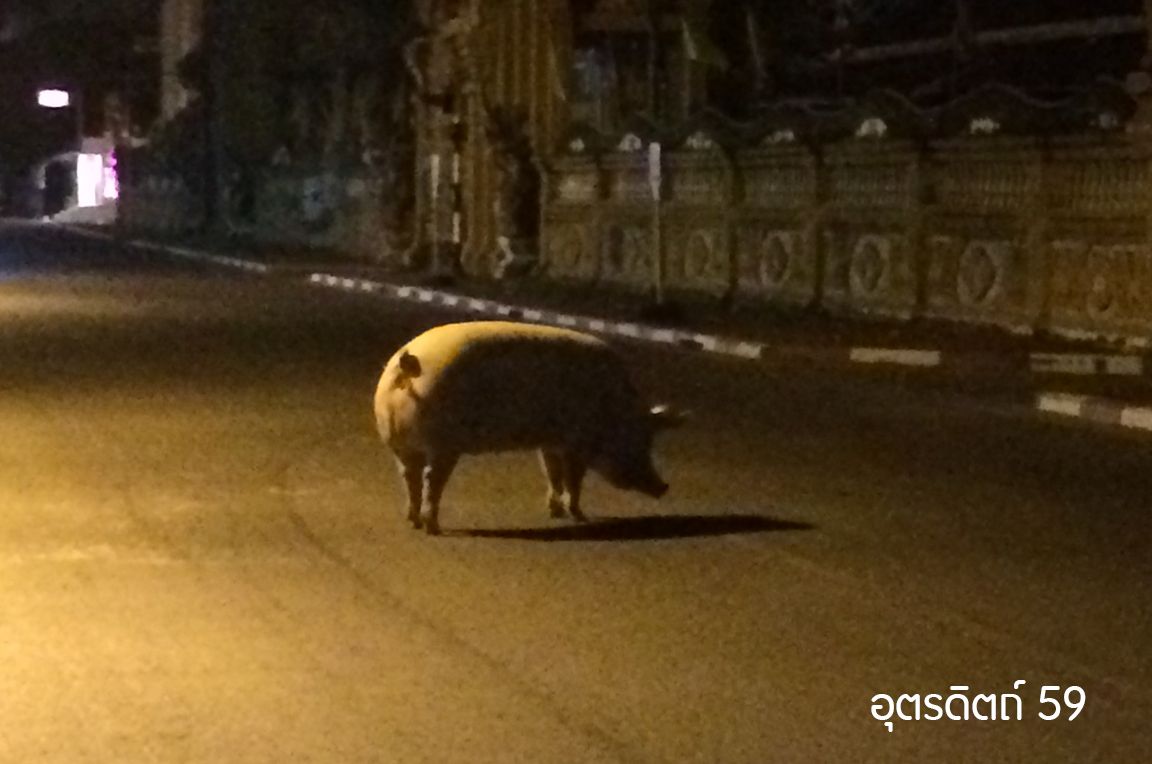 พออาบน้ำแต่งตัวเสร็จ เพื่อนก็ให้ยืมผ้าพันคอมา ความจริงเราไม่คิดว่าอุตรดิตถ์จะหนาวมากขนาดนี้ เพราะกรุงเทพฯ ร้อนมาก ดีที่ตอนเดินทางมาเราแบกเป้มาจากที่ทำงาน เลยมีกางเกงยีนขายาวอยู่ด้วยเลยรื้อๆ ออกมาใส่พร้อมเสื้อหนาวที่ติดมาจากที่ทำงานและผ้าพันคอที่ได้ยืมจากเพื่อน แต่เพื่อนเตรียมมาพร้อมมากเหมือนรู้ว่าจะหนาว ตอนนั้นแอบเคืองนิดนึงว่าไม่บอกเรา เลยไม่ได้เตรียมชุดที่หนาพอมา พอเมื่อจัดการตัวเองเรียบร้อยกันเสร็จก็ออกมาลาเจ้าของที่พักที่จะออกเดินทางไปกรุงเทพฯ แต่เช้ามืดเหมือนกัน และปั่นจักรยานตามเพื่อนออกไป ความจริงเราก็เป็นคนปั่นจักรยานเก่ง ปั่นแบบมือเดียวจับ ตีโค้งทรงตัวแบบสบายๆ แต่จักรยานของศูนย์บริการนักท่องเที่ยวนี่แข็งมาก แถมปั่นลำบาก ทำให้เราตามเพื่อนไม่ค่อยทัน ฟ้าก็มืดมาก เราก็ยิ่งกังวล ตอนแรกอยากให้เพื่อนขี่มอเตอร์ไซด์มามากกว่า แบบไปด้วยกันแบบนี้แต่ก็เกรงใจเพื่อน เพราะเขาอยากปั่นจักรยาน เราก็เลยต้องพยายามปั่นตามเขาไปเรื่อยๆ แม้ยอมรับว่ากลัว "ผี" มาก จนเลี้ยวมาที่ "วัดเสาหิน" เราก็เจอสิ่งที่เราอยากทิ้งจักรยานวิ่ง แต่ทำไม่ได้ เพราะอาจทำให้ชีวิตลำบากกว่าเดิม มันอาจดูเป็นเรื่องตลกว่าสิ่งที่อยากทำให้เราทิ้งจักรยานวิ่งคือ "หมู" ตัวหนึ่ง แต่ตัวใหญ่มาก และมาอยู่กลางถนนดึกๆ ดื่นๆ แม้จะตีห้าแล้วก็ตาม แต่เรายอมรับว่ากลัวมันทำร้าย แต่เพื่อนเรากลับสนใจมันมาก และพยายามถ่ายภาพ เราเลยทำใจดีสู้เสือบ้าง เมื่อเพื่อนเอากล้องถ่ายรูปมาถ่าย เราก็เอามือถือเรามาถ่ายภาพบ้าง เป็นที่ระลึกว่าเคยมาเจอหมูยักษ์แถวนี้ แต่เราก็รู้ว่ามันมาจากวัด เพราะไม่นานหลังเราถ่ายภาพ มันก็เดินเข้าวัดไป