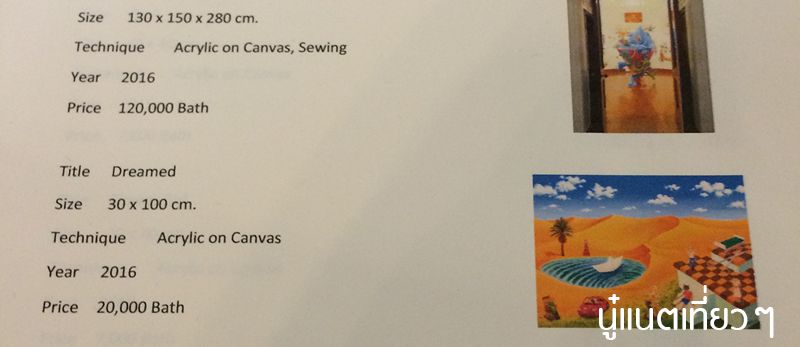 ซึ่งเจ้าหน้าที่บอกไม่เสียค่าใช้จ่าย แต่ห้ามถ่ายภาพ เราเลยเดินเข้าไปดู ซึ่งก็เหมือนนิทรรศการทางศิลปะที่เหมาะกับวันเด็กนะ เพราะตุ๊กตาเต็ม แต่ถ่ายภาพใบที่เป็นราคาของชิ้นงานและรูปผลงานที่วางอยู่ข้างหน้าห้องจัดนิทรรศการมาได้1 หน้า ราคาแต่ละชิ้นงานก็ตามขนาดและความยาก บางชิ้นก็หลักพัน แต่ชิ้นใหญ่ก็หลักแสน ซึ่งเป็นชิ้นเด่นสุดที่ตั้งอยู่กลางห้องเลย 120,000 บาท