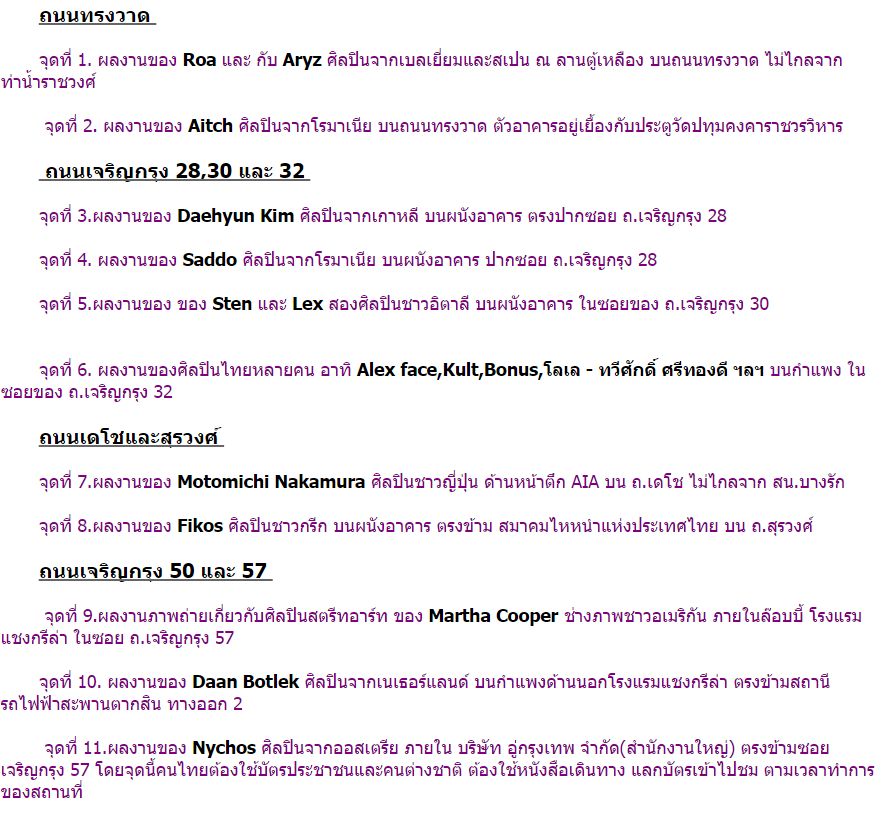 - ภาพ "Street Art" ของโครงการ "บุกรุก" อยู่ซอยเจริญกรุง 28,30,32,50,57,ถ.เดโช,ถ.สุรวงศ์และถ.ทรงวาด