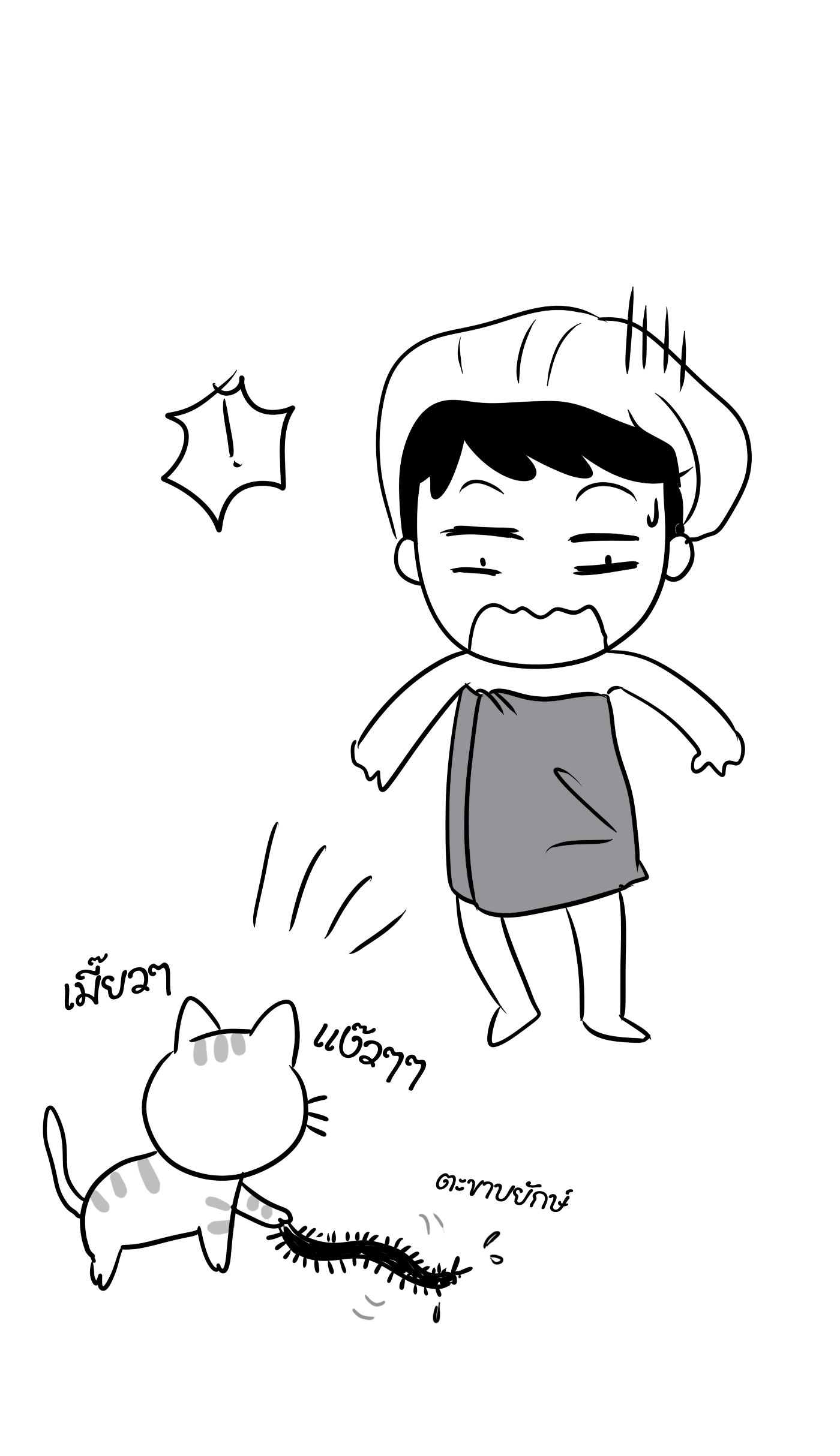 พอวิ่งออกมาดู ทั้งๆที่ตัวเปียกอยู่ ก็พบว่าเขียวกำลังเอามือทาบไปที่ตะขาบตัวใหญ่อยู่