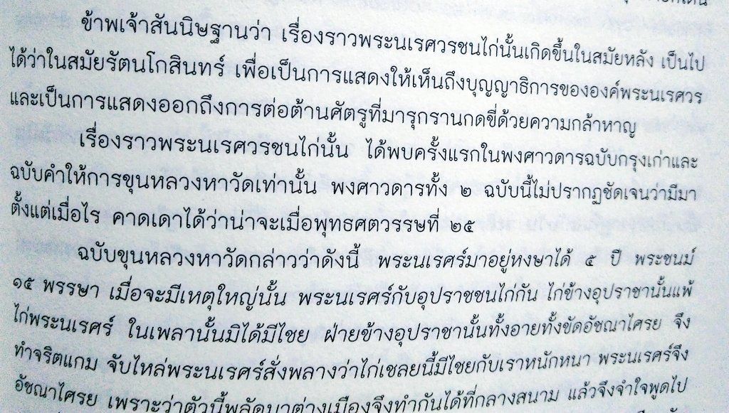 "...ตรงนี้ ข้าพเจ้าขอวิจารณ์การแต่งประวัติศาสตร์ใหม่ของนักแต่งประวัติศาสตร์ชาวไทยทั้งหลายสักนิดว่า พวกท่านไม่ให้เกียรติ และทำลายพระเกียรติของพระองค์ (พระนเรศวร) เป็นอย่างมาก โดยแต่งเรื่องราวให้พระองค์กลายเป็นอันธพาลและอกตัญญู เช่น พระองค์ชอบเรื่องพนันชนไก่ และยังทะเลาะวิวาทในวงไก่ชน จนเอามาเป็นเหตุอาฆาตเกลียดชังกัน จนถึงกับยอมแลกชีวิต