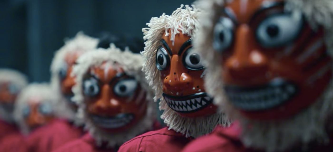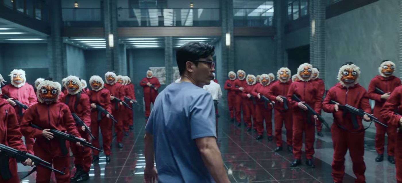 แต่เราจะได้เห็นว่ามีอีกหนึ่งหน้ากากที่เป็นหนึ่งในฉากสำคัญของเรื่องเช่นกัน ซึ่งปรากฎอยู่ในฉากที่กลุ่มโจรและตัวประกันได้สับเปลี่ยนหน้ากากกระทันหันหลังจากที่ทีมแพทย์และตำรวจที่ปลอมตัวเข้าไปได้ทำการรักษาตัวประกันที่ได้รับบาดเจ็บเรียบร้อยแล้ว หน้ากากนั้นก็คือ หน้ากากสิงโต (사자탈) เป็นหนึ่งในตัวละครของการแสดงหน้ากากที่มีชื่อว่า การแสดงระบำหน้ากากพงซัน (봉산탈춤) มีต้นกำเนิดมาจากเขตพงซัน จังหวัดฮวังแฮ ประเทศเกาหลีเหนือ