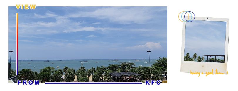 ถึงพัทยาเกือบเที่ยง เราบอกเขาว่าเราจะไปลงที่วอคกิ้งสตรีท เพราะดูจากกูเกิ้ลแมพที่พักเราอยู่แถวนั้นพี่คนขับเลยปล่อยเราลงตรงที่มีสองแถว แต่ที่พักเช็คอินได้บ่ายสอง พวกเราเลยนั่งรถสองแถวไปเซนทรัลก่อนค่าโดยสาร 10 บาท ไปถึงด้วยสภาพหิวโซพยายามคิดว่าในนี้มีร้านอะไรที่พอกินได้บ้าง แบบไม่แพง เพราะจนจัดๆ 5555555555 เลยตัดสินใจกิน KFC กัน กินเคเอฟซีคนละ 90 บาท ถามว่าอิ่มมั้ย ก็คือไม่ แต่พอรองท้องได้ แต่เคเอฟซีที่นี่วิวดีมากเลยทุกคน แนะนำให้ออกมานั่งทานข้างนอกกินไปชมวิวทะเลไป ได้ฟีลไปอีกแบบ กินไปสักพัก ฝนตกจ้าาา เลยถือกำเนิด #คนดวงไม่ดี2019 แต่ครั้งนี้ยังถือว่าไม่แรงมาก ยังนั่งชมวิวได้อยู่ แต่แพลนก็คือจะไปเกาะล้านวันนี้ไง จะได้ไปมั้ยยยยย พอกินเสร็จเราก็เดินกันชิวไปเรื่อยๆจนถึงบ่ายสองเลย