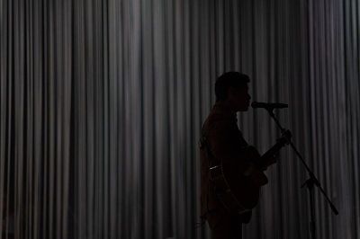 ชอบแตมใส่สูทสีนั้น สะพายกีตาร์โปร่งตัวเดียว ยืนอยู่บนเวทีคนเดียวข้างหน้าฉากแบบนั้น //ฟิลนั้นชอบมากกกก